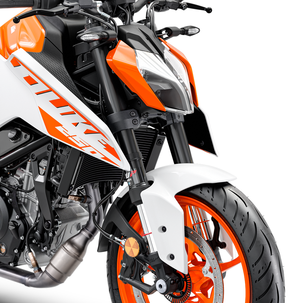 - Ön tekerlekte KTM 250 DUKE, yepyeni dört pistonlu radyal kaliperlere sahip 320 mm'lik bir fren diskine sahiptir. Yeni tasarım, daha uzun balata ömrü ve solmaya karşı dirençte iyileştirmelerle birlikte çalışma sıcaklığını düşürmek için daha büyük diskler içerir. Arka tekerleğe, ön tekerlekle aynı avantajları taşıyan yepyeni bir çift pistonlu kaliper ile 240 mm'lik bir fren diski takılmıştır. Viraj ABS'si ve SUPERMOTO ABS de standart özelliklerdir.