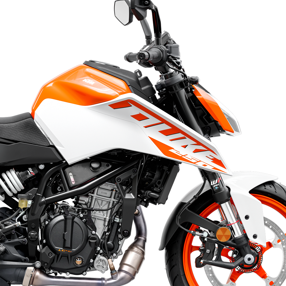 - Üstün görünüm 2024 KTM 250 DUKE'da standart olarak sunulmaktadır. Yepyeni Elektrik Turuncusu veya Seramik Beyazı renklerinde yüksek kaliteli, çok katmanlı, ıslak boyalı kaplama ve canlı grafikler, benzersiz DUKE dokulu koltuk kılıfını mükemmel bir şekilde tamamlar. Hiç şüpheniz olmasın, bu %100 DUKE ve %110 sokak ruhu.