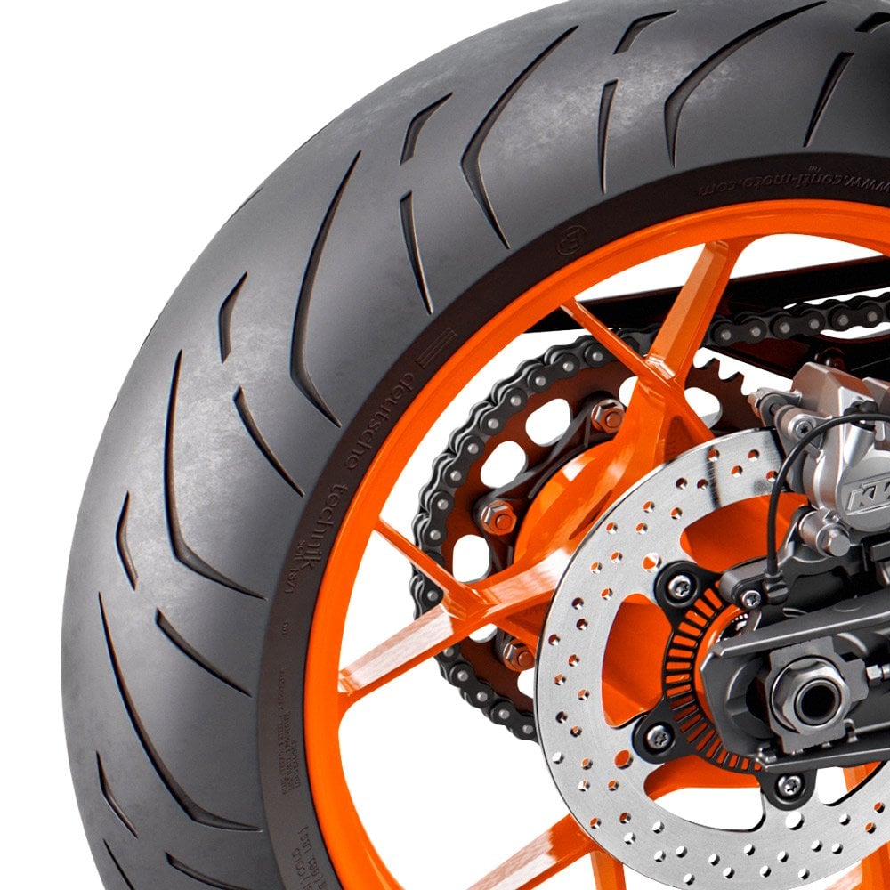 - KTM 890 DUKE GP, standart olarak Continental ContiRoad kauçuğu ile donatılmıştır. Bunlar, gelişmiş ıslak hava tutuşu, artırılmış dayanıklılık ve denge sağlayan ve tüm yol yüzeylerinde doğal, kolay yol tutuşu sunan ultra hızlı ısınma teknolojisine sahiptir.